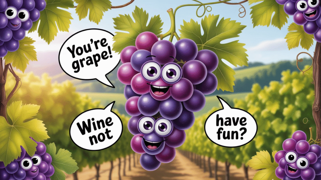 Every grape pun brings instant joy to conversations. These classics never fail to make people laugh out loud. You’ll discover timeless humor that works anywhere, anytime. Share these grape puns with anyone who needs a smile today.